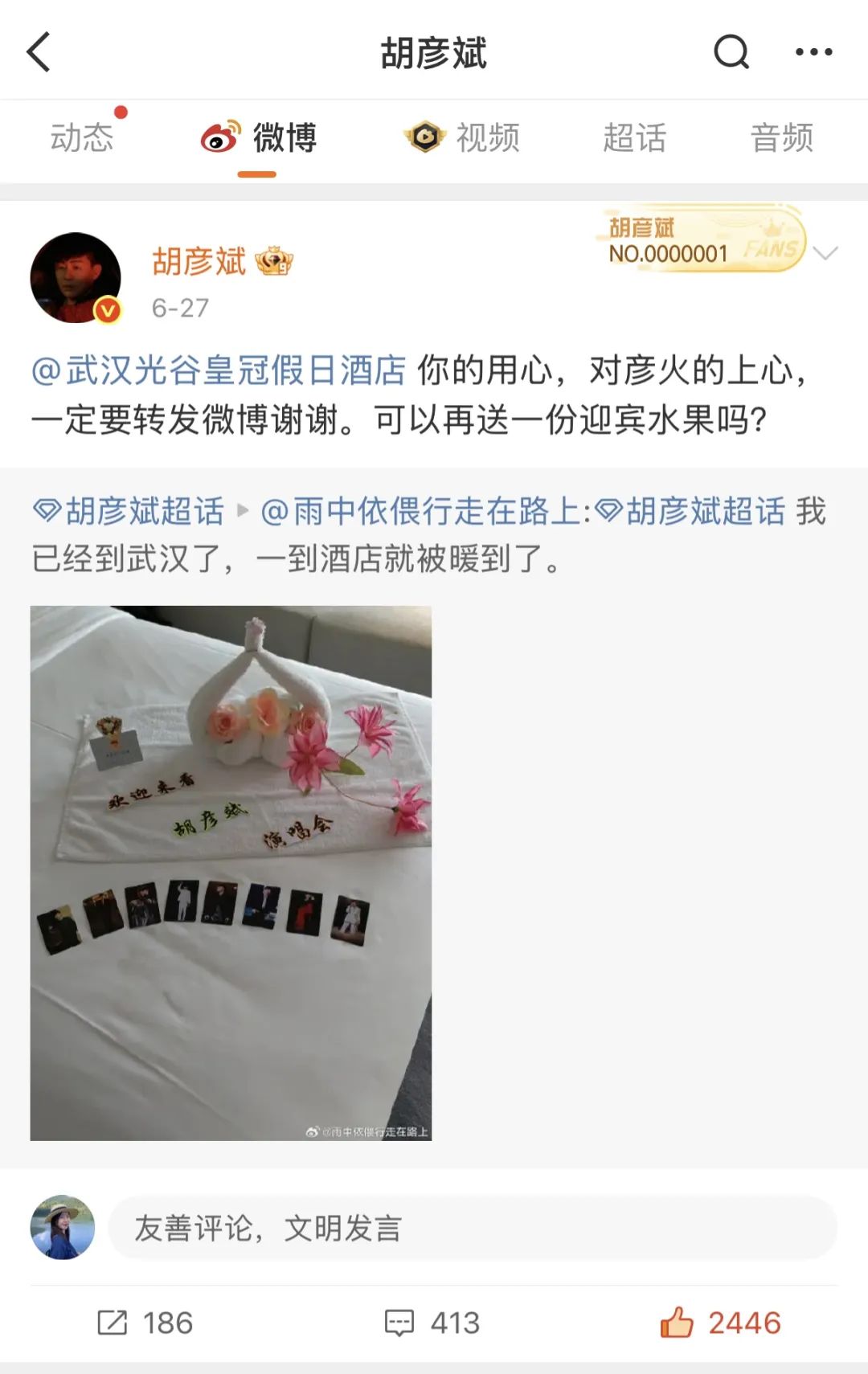 前不久,胡彦斌演唱会在光谷举行,皇冠假日酒店为粉丝“彦火”们安排了水果礼盒与“彦火”主题应援房间,获得胡彦斌本人点赞