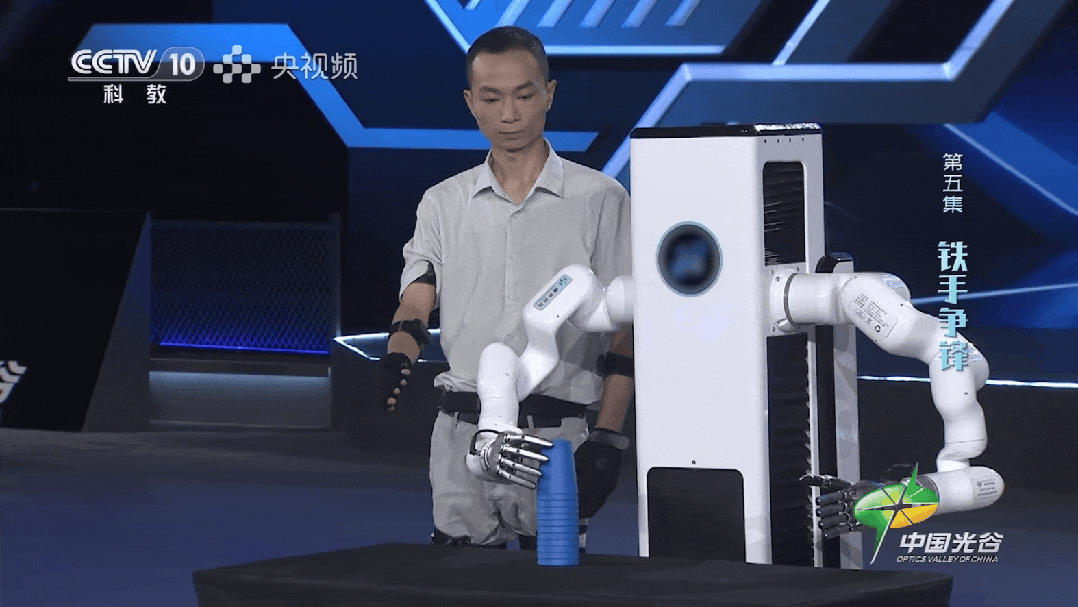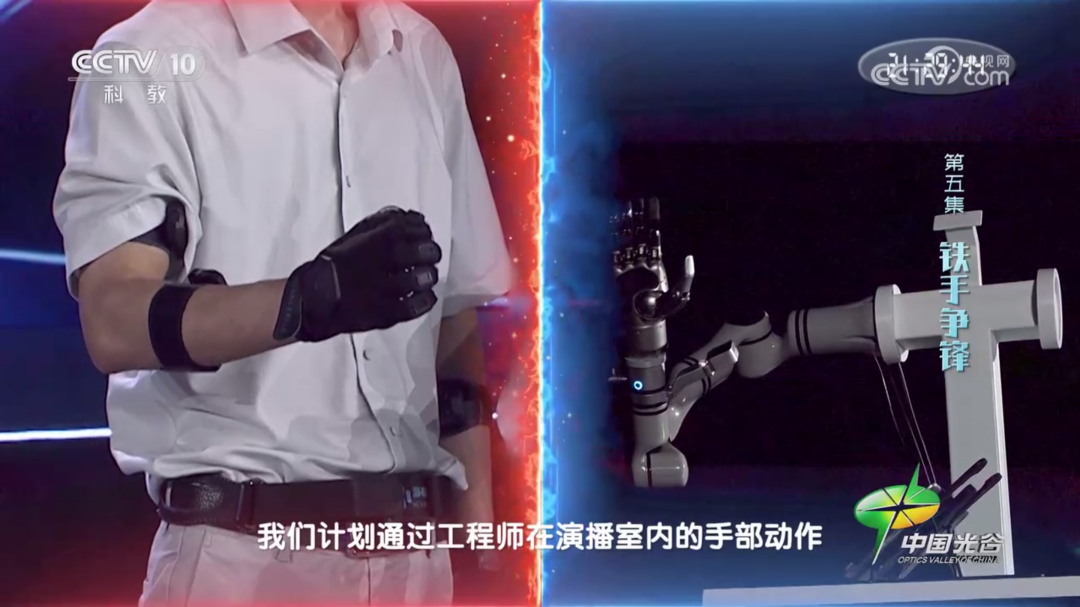 本期节目展示的最后一项人形机器人技术——运动神经中枢系统,由光谷企业灏存科技自主研发。现场,人类工程师通过穿戴一双特殊的“手套”,让机器人能远距离精准模仿人类动作并完成复杂任务,甚至在演播室内远程遥控位于黄鹤楼的机器人,成功启动灯光秀。