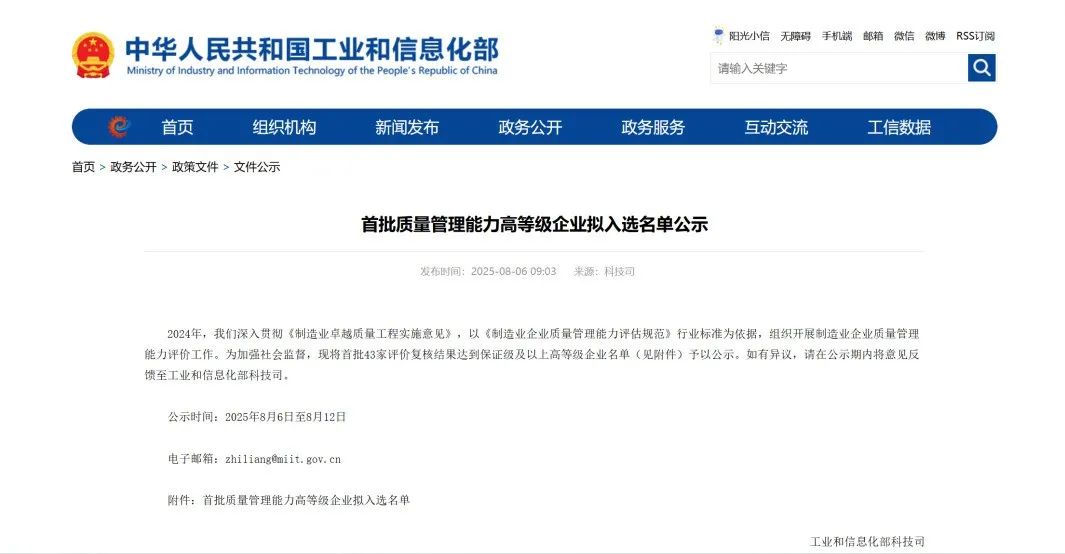 近日,工业和信息化部发布首批“质量管理能力高等级企业”公示名单,全国共43家企业入围。