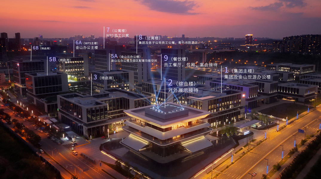 武汉金山软件园位于光谷四路和高新五路交汇处,总建筑面积28万平方米,以“科技与人文共生”为设计理念,集研发、生活、休闲于一体,最多可容纳9000人同时办公,是金山集团规模最大的研发中心。金山集团CEO邹涛表示,武汉和光谷将成为金山发展的主战场。