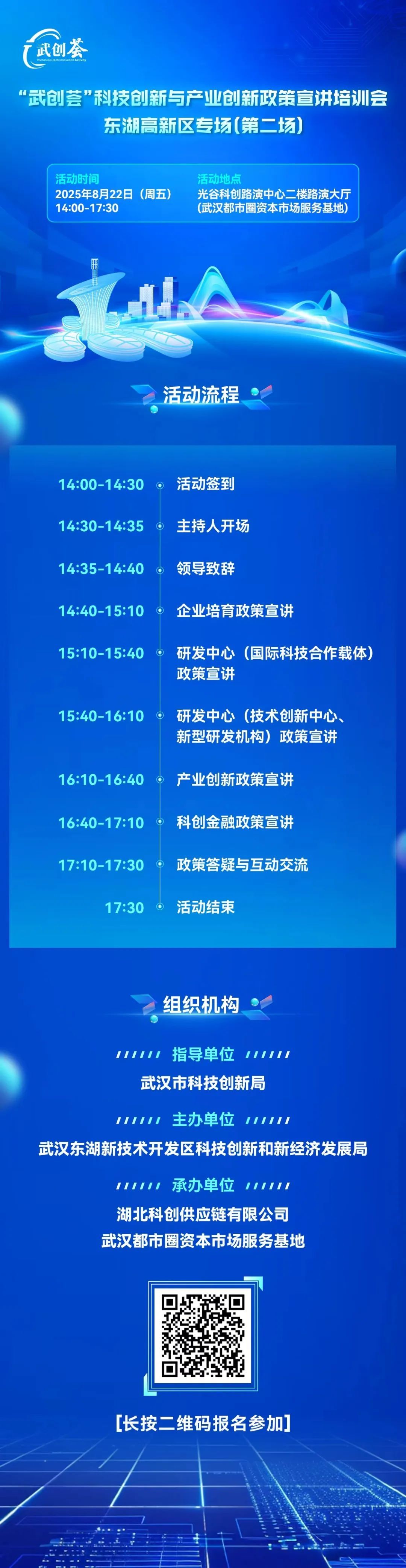 活动将深度解读武汉市企业培育、研发中心、产业创新和科创金融等最新惠企政策,重点讲解核心条款、政策申报、资金补贴等实操要点,致力于帮助企业用足用好政策,助推企业高质量发展。