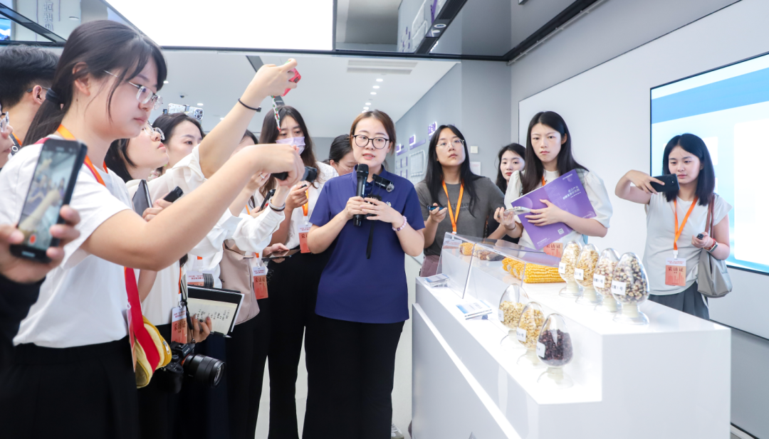 在武汉产业创新发展研究院展厅,高产高蛋白宜机收玉米、人形机器人“劳动者1号”等创新成果吸引记者们拿起手机、相机拍摄。
