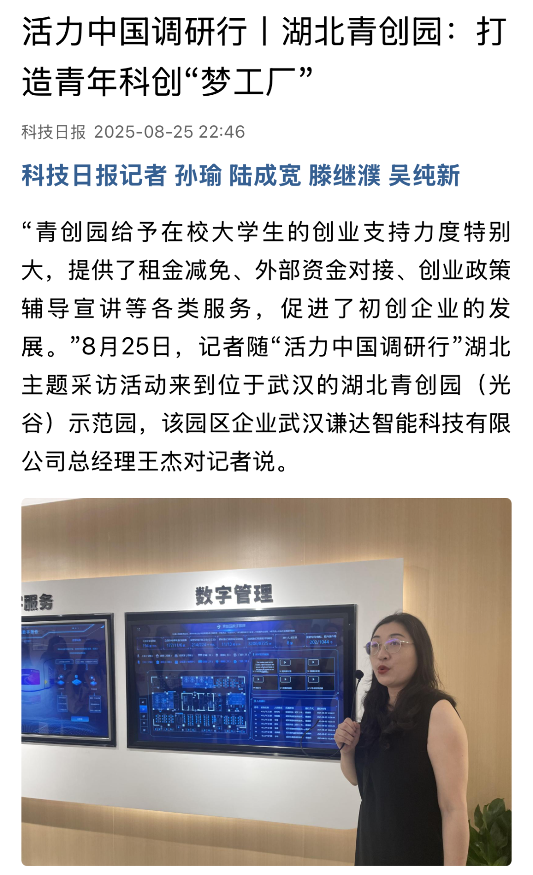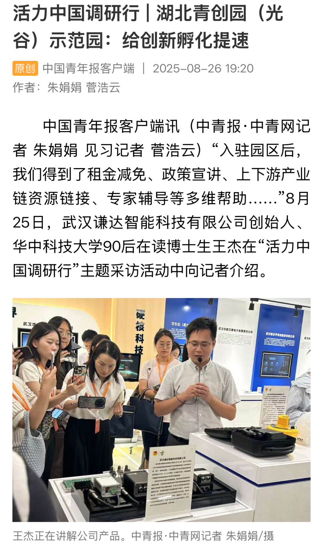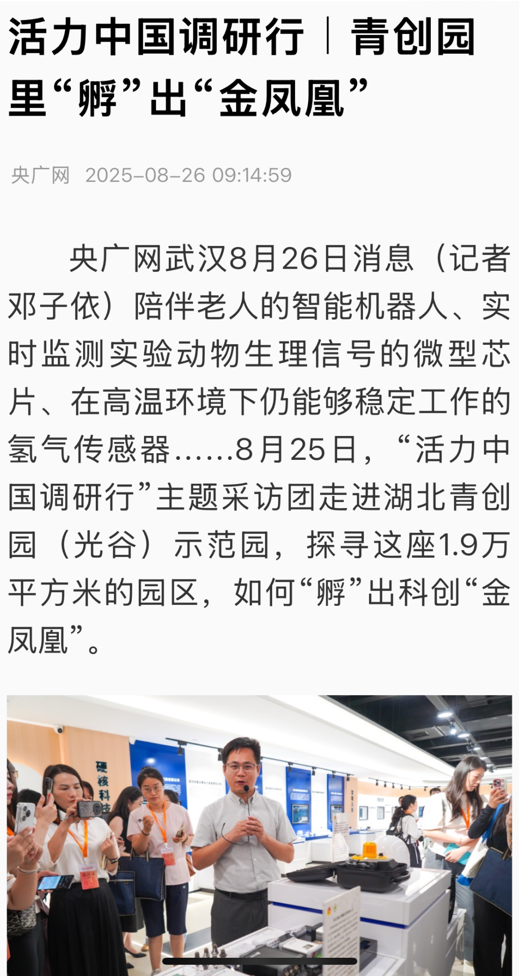 25日下午,媒体团走进湖北青创园(光谷)示范园,了解200多家企业在这里的成长故事——创现科技的智能软表面清洁机器人月均销量超1万台,并保持近20%的增长;谦达智能自研国内氧化锆基高温气体传感器控制器技术,产品能在-40℃-930℃环境下稳定工作。