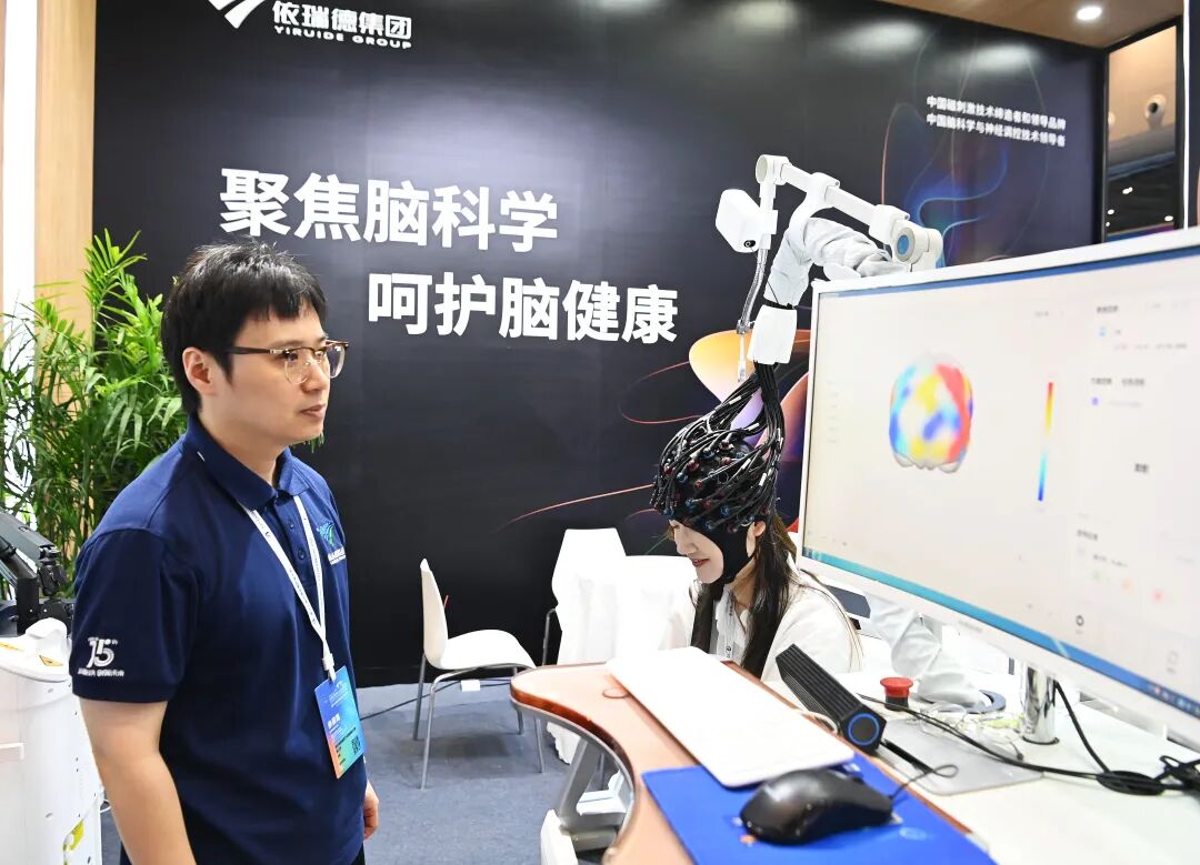 在光谷企业依瑞德展厅,不少“睡不着”“情绪差”的观众现场体验起无创脑机接口与神经调控设备。“该设备通过精准调控患者大脑神经活动,能改善使用者的精神状况。”公司医学部部长尧利书说。“此次大会我们还上新了aimQ光学导航系统,医生通过移动线圈拍,即可快速精准定位治疗区域,定位误差在1毫米以内,比临床常用的定位帽更精准。”