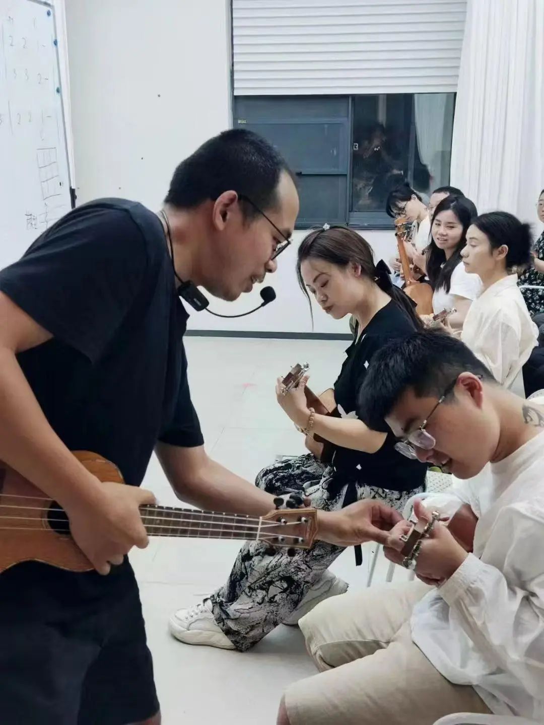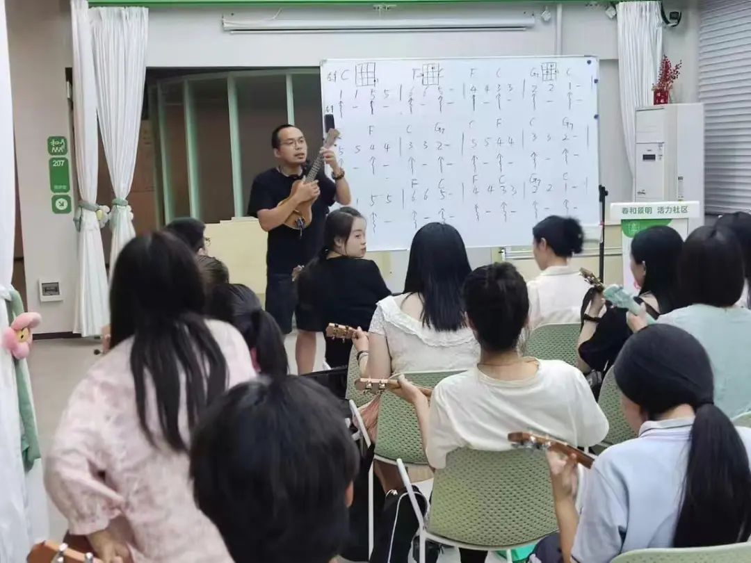 作为花山青年夜校的尤克里里老师,从去年夏天开始,他已连续开展3期课程,他的课堂氛围总是最轻松活跃的,课堂上总能看到他修改曲谱、录制教学视频的身影。