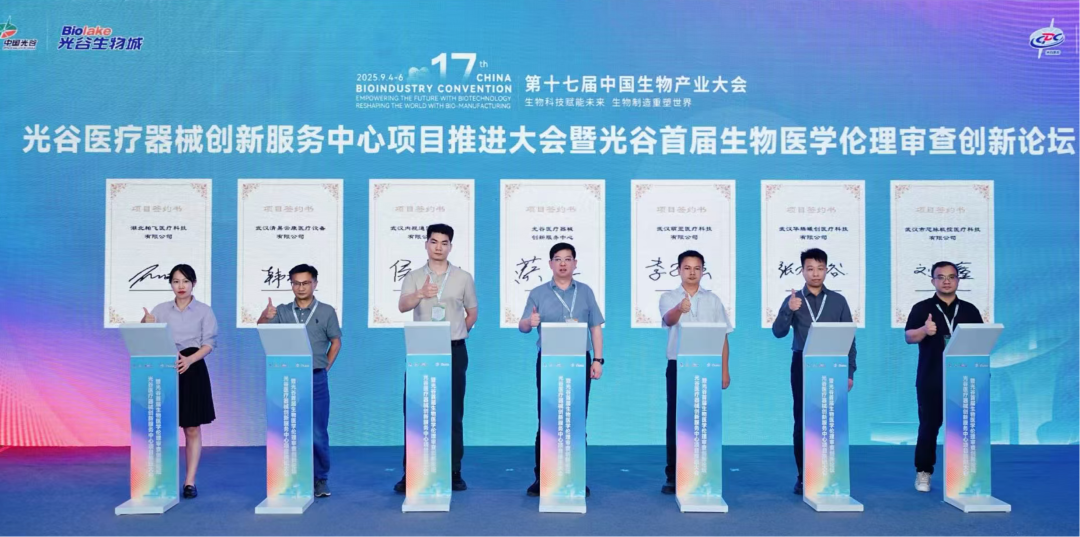 同日,光谷医疗器械创新服务中心项目推进大会暨光谷首届生物医学伦理审查创新论坛现场,芯脉极控、内视通医疗、萌翌医疗、华腾曦创公司分别就“迷走神经刺激装置”“经皮肾内碎石取石系统”“甲状腺旋切电凝刀”“激光骨科机器人”4个医工融合项目与光谷医疗器械创新服务中心集中签约,在光谷落户并开展技术转化。