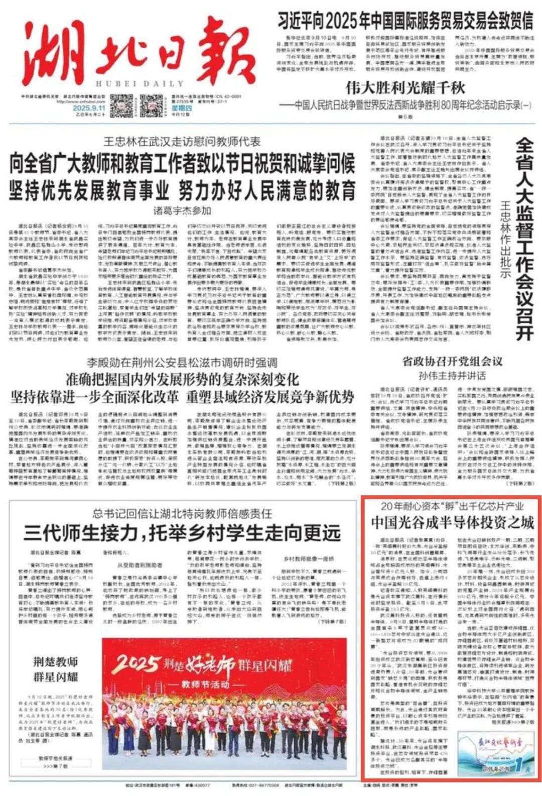 9月11日,湖北日报刊发报道《20年耐心资本“孵”出千亿芯片产业 中国光谷成半导体投资之城》。以下为全文转载。