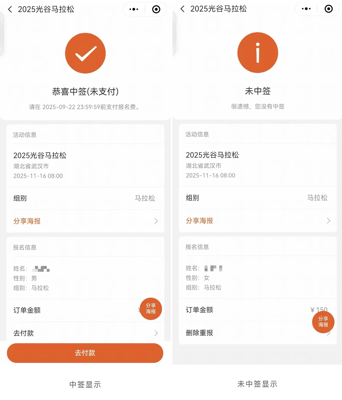第一轮中签缴费结束后如有选手中签未缴费,产生剩余名额,组委会将进行第二轮抽签,第二轮抽签结果将仅对于第二轮中签选手进行通知,选手收到第二轮中签通知后可登录光谷马拉松小程序查询中签状态,及时完成缴费。