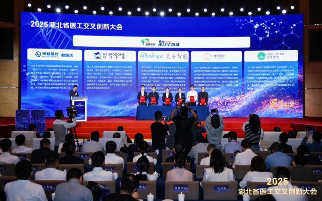 现场,微灵医疗、穹顶医疗、曼安智能、神畅医疗、格林泰克5家企业代表与光谷生物城签约,首批入驻光谷脑机接口产业集聚区。