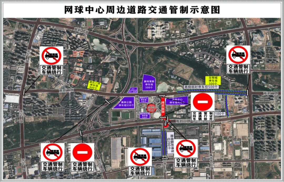 为确保观众及车辆安全有序集散,每场活动开始前1小时至工作结束,对光谷网球中心周边道路采取以下临时性交通限制借施: