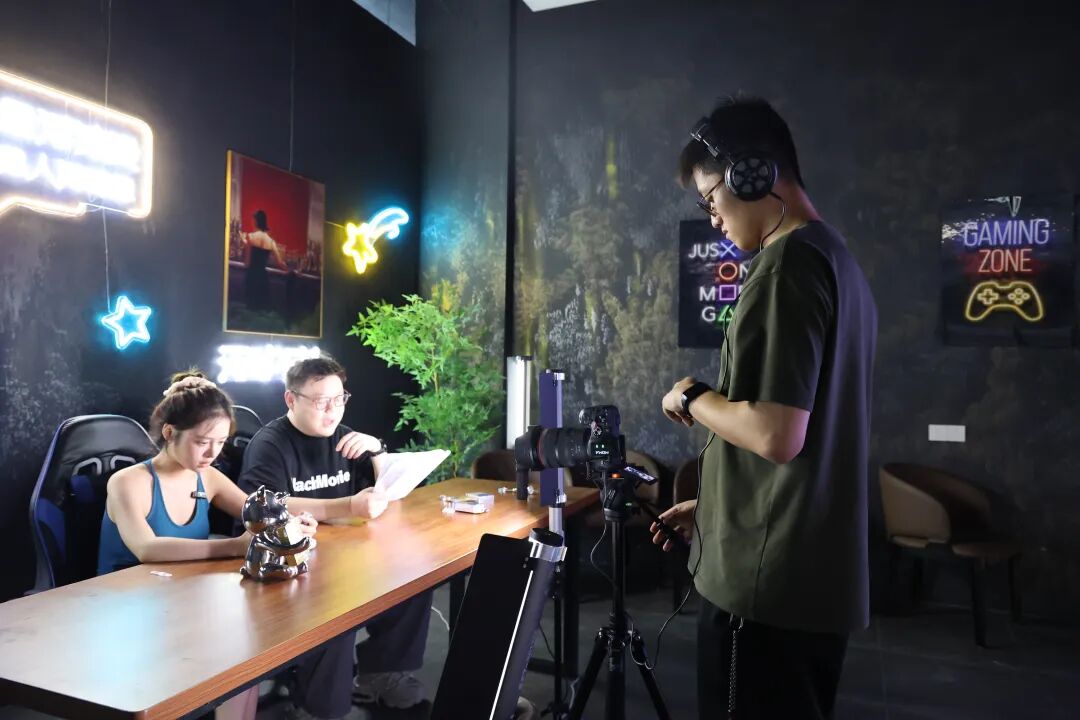 国庆假期前后,位于光谷的长江视听微短剧产业基地内,咖啡厅、酒吧、医院、家庭、教室等场景影棚里站满了人,7个短剧组正同时拍摄。这是目前华中地区规模最大、场景最全的短视频拍摄基地,就在武汉东站地下,广告导演刁宇晟说:“团队上午出创意,下午就能进棚拍,下了高铁立马干活。”