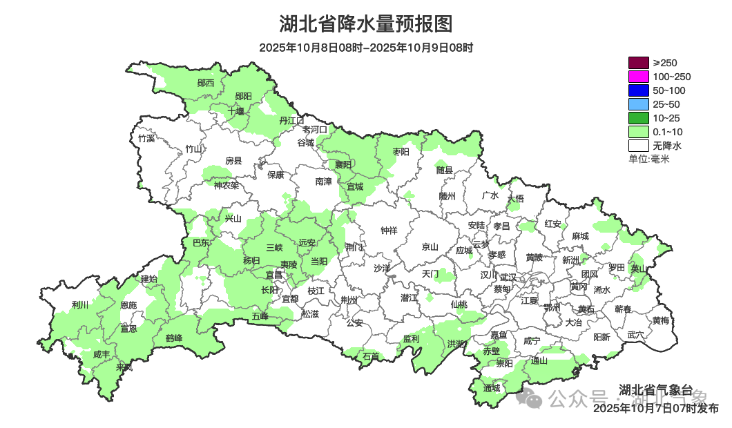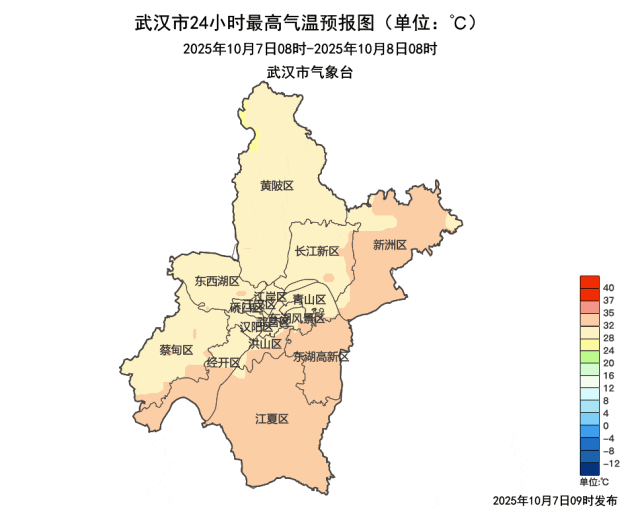 据湖北气象报道,10月8日08时-10月9日08时,鄂西北、鄂西南阴天到多云有阵雨或雷阵雨;其他地区多云到晴天,局地有阵雨或雷阵雨。最高气温鄂西北26~32℃、其他地区32~36℃,最低气温中西部19~22℃、东部22~26℃,偏东风2到3级。