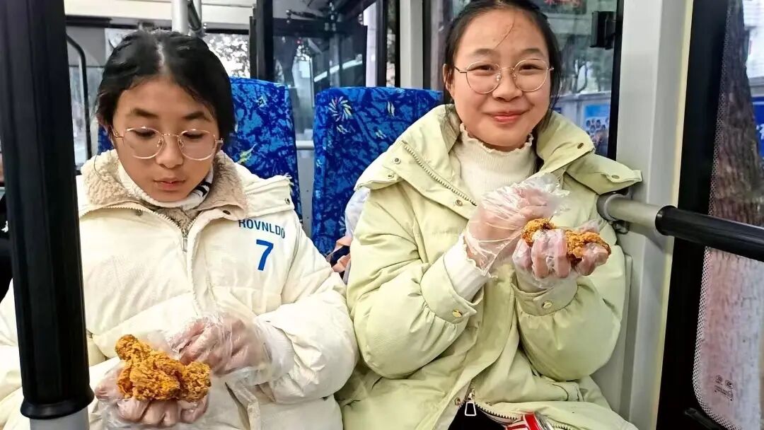 去年12月底,得知孩子们想收到一份新年礼物,他提前自费订购了几十份炸鸡腿、饮料,在新年第一天放学时送给他们。那时的车厢里,气氛热闹得像开联欢会一样。