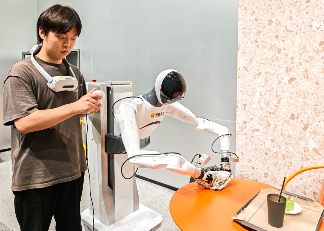 每天,他都会用遥控手柄带着人形机器人上“实践课”。在完成冲咖啡、熨衣服等复杂工作时,他还会穿上动作捕捉服,同时遥控人形机器人肩、肘、腕等全身关节。他总结道:“一开始动作不能太快,要像电流流过一样,每个关节依次活动。”