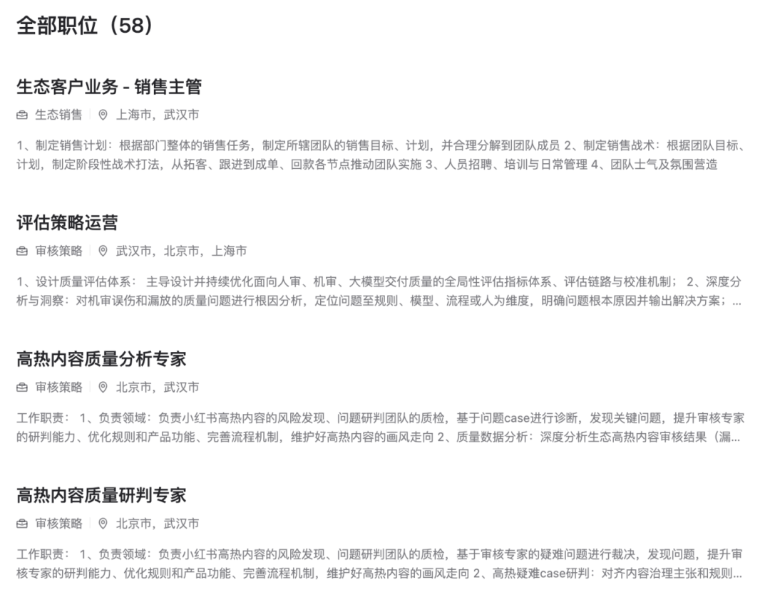 1、负责领域:负责小红书高热内容的风险发现、问题研判团队的质检,基于审核专家的疑难问题进行裁决,发现问题,提升审核专家的研判能力、优化规则和产品功能、完善流程机制,维护好高热内容的画风走向;