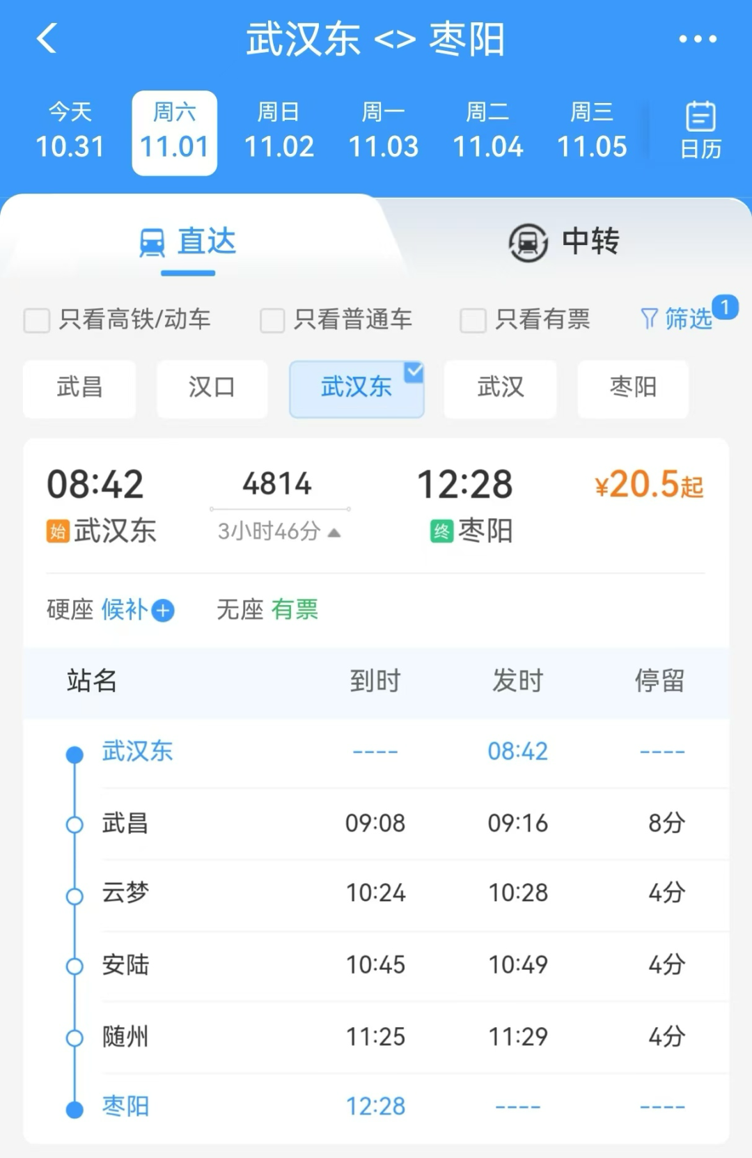 其中,武汉东站4814列车8:42始发,12:28抵达枣阳站,全程3小时46分,经停武昌、云梦、安陆、随州4个站点。枣阳站4816列车13:13始发,17:10抵达武汉东站,全程3小时57分,经停随州、安陆、云梦、武昌4个站点。