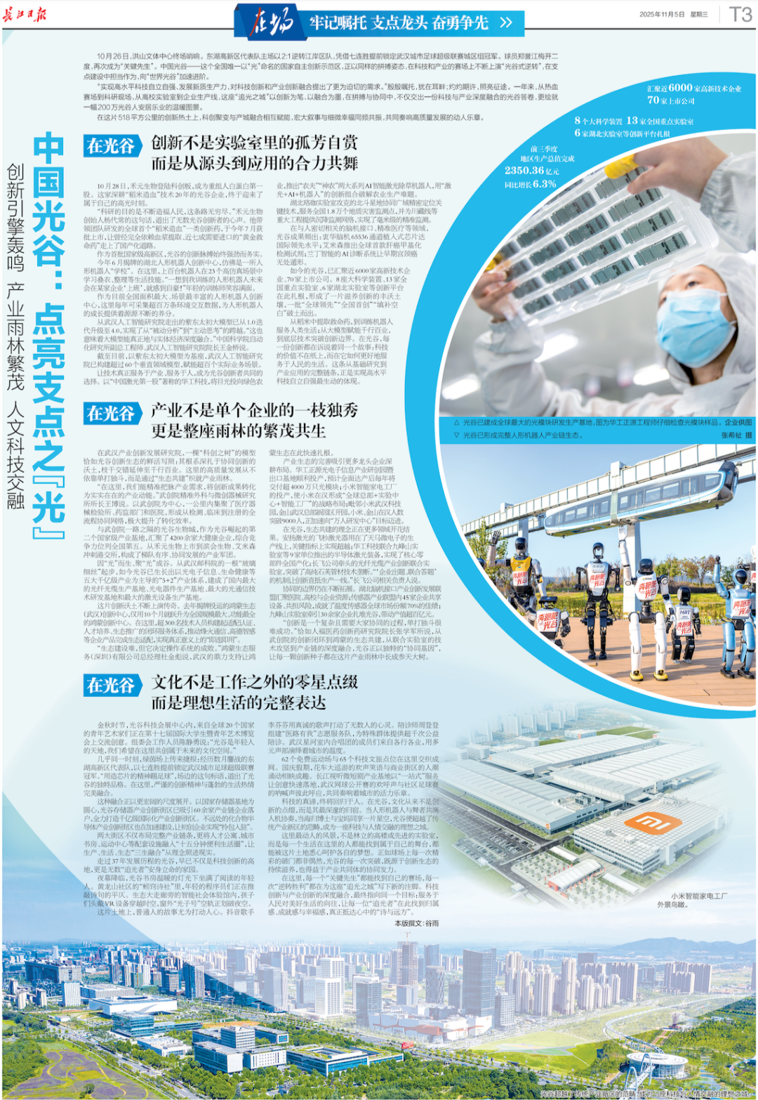 11月5日,长江日报“牢记嘱托 支点龙头 奋勇争先”专栏刊发整版报道《中国光谷:点亮支点之“光”》,以下为全文转载。
