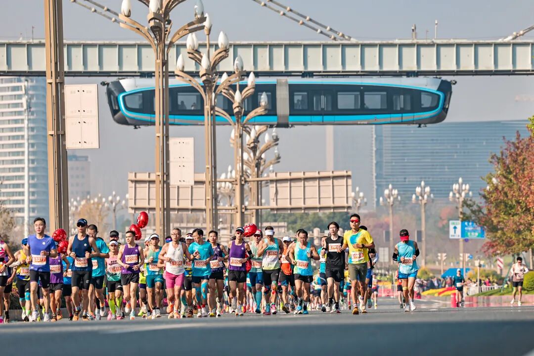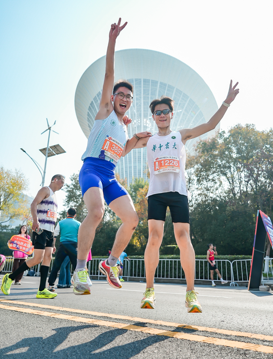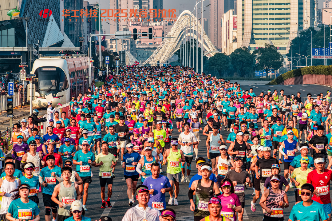 11月16日华工科技2025光谷马拉松举行1.3万余名跑者从华中科技大学出发共同奔跑在“高”“新”大道上体验这一场科技感十足的“赛博光马”