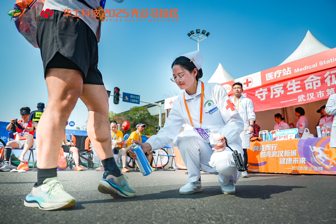 在全马和半马冲线处,每当有跑者抵达终点,来自武汉大学中南医院、武汉市第三人民医院、光谷各社区卫生服务中心等医疗机构的医务工作者便立即迎上前,为有需要的跑者提供服务。