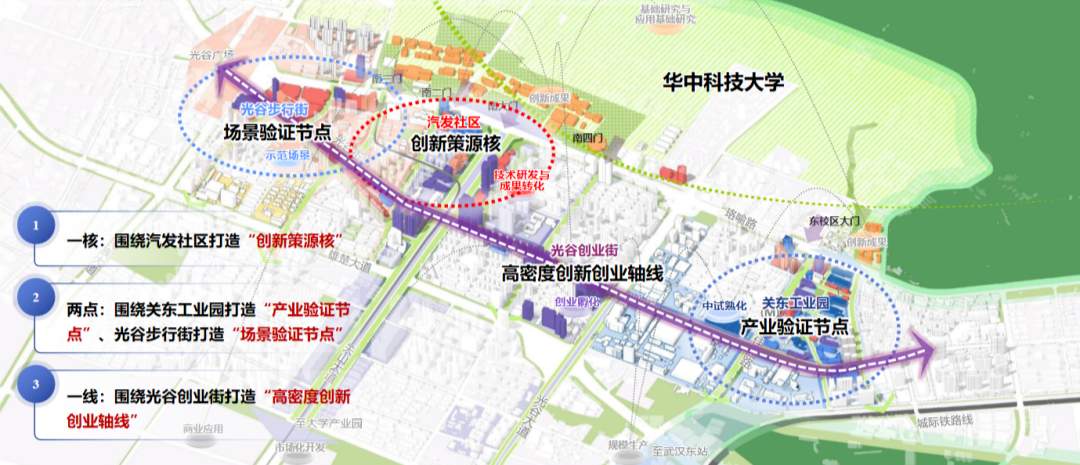 “一核”汽发社区位于华科大南门对面,建于60多年前,为武汉汽轮发电机厂的员工宿舍。社区未来将重点建设创新创业大厦、华科大校友企业总部中心、光谷国际天使投资中心等科创载体,集聚华科大高能级创新平台、研发型企业总部、国际一流科研机构、头部风投创投机构,成为关山大道科创地标。