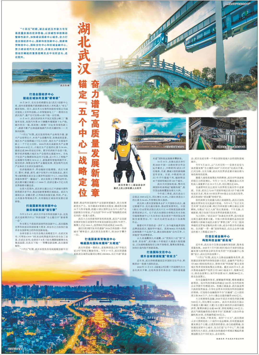 今天(12月4日),《人民日报》19版整版刊登报道《湖北武汉锚定“五个中心”战略定位 奋力谱写高质量发展新篇章》,聚焦“十四五”时期湖北省武汉市加快建设国家中心城市全力打造全国经济中心、国家科技创新中心、国家商贸物流中心、国际交往中心和区域金融中心。以下为全文转载。