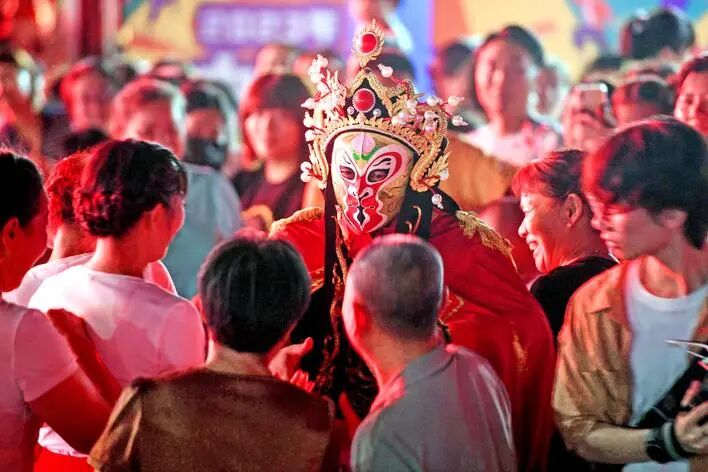 台上嗨翻天,台下吹糖、泥人、糖画、草编等非遗体验项目的摊位前,居民们一边欣赏表演,一边等待着领取非遗传人的作品。