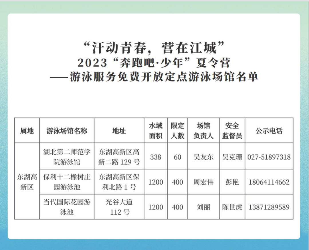 这个夏天,东湖高新区有3家游泳场馆免费向青少年开放。7月10日至8月8日,共30天,每天上午9:00-11:00;下午15:00-17:00集中开放,人满后即停止入场。
