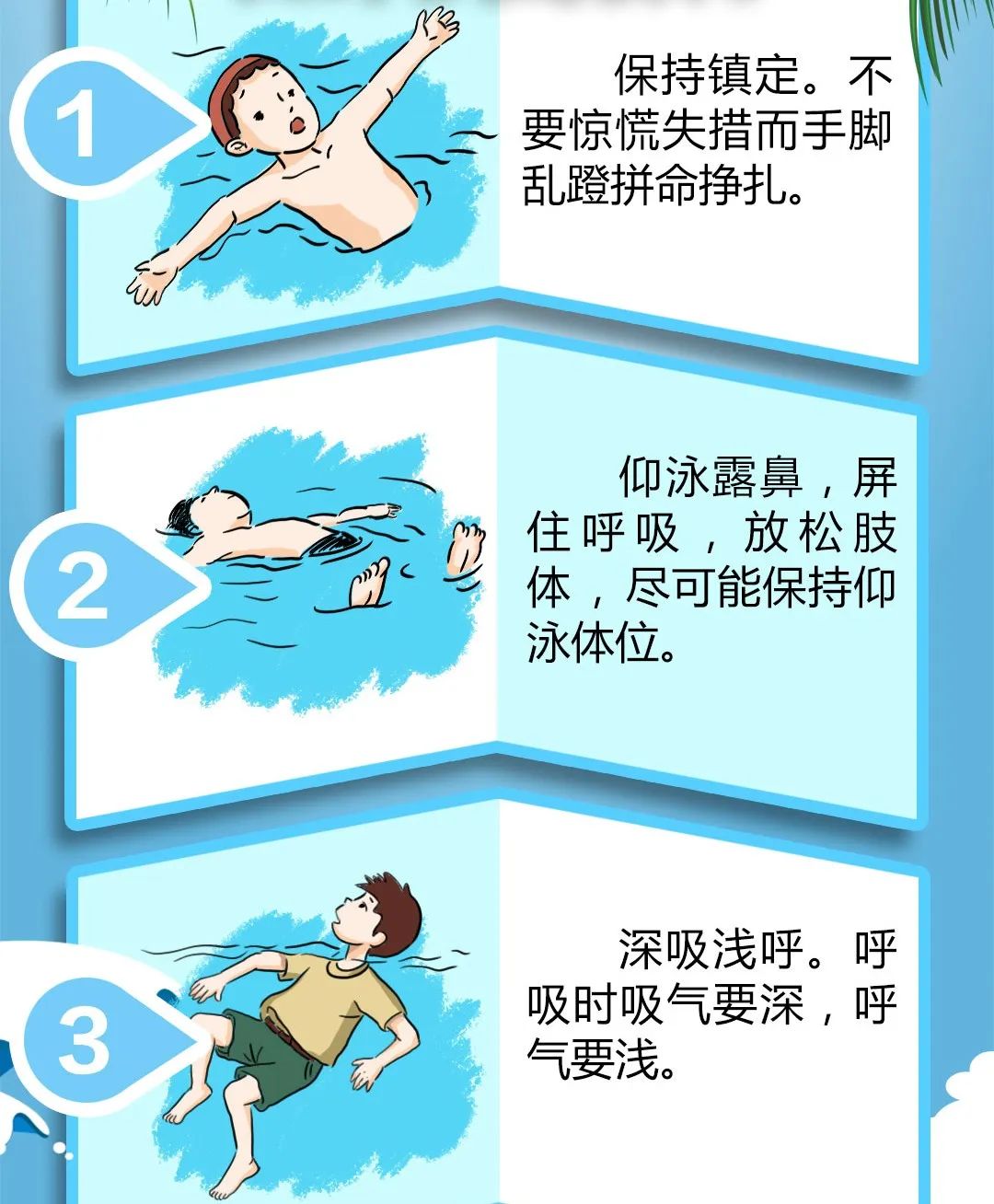 2、放松全身,面朝天空方向,让身体漂浮在水面上,可用脚踢水,防止体力丧失,等待救援。