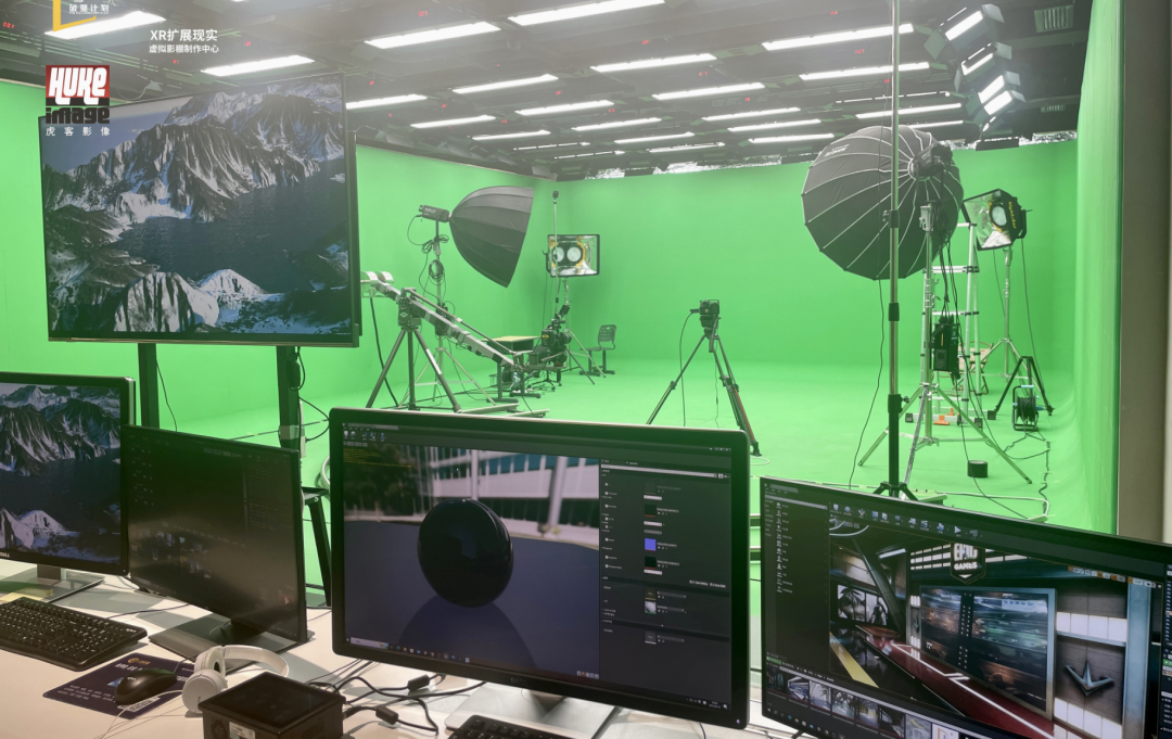 这是一个占地约200平米的巨大绿箱,地面和墙壁全部为绿色背景,头顶有近百盏灯光,场内架设有摄像机、摇臂、轨道等,人物在绿箱中的影像,可实时合成到各种背景中,上天入地,无所不能。与以往技术不同,合成背景不再是一幅图像或者视频,而是一个三维场景,可随着摄像机移动相应作出调整,并实时渲染输出逼真的图像。