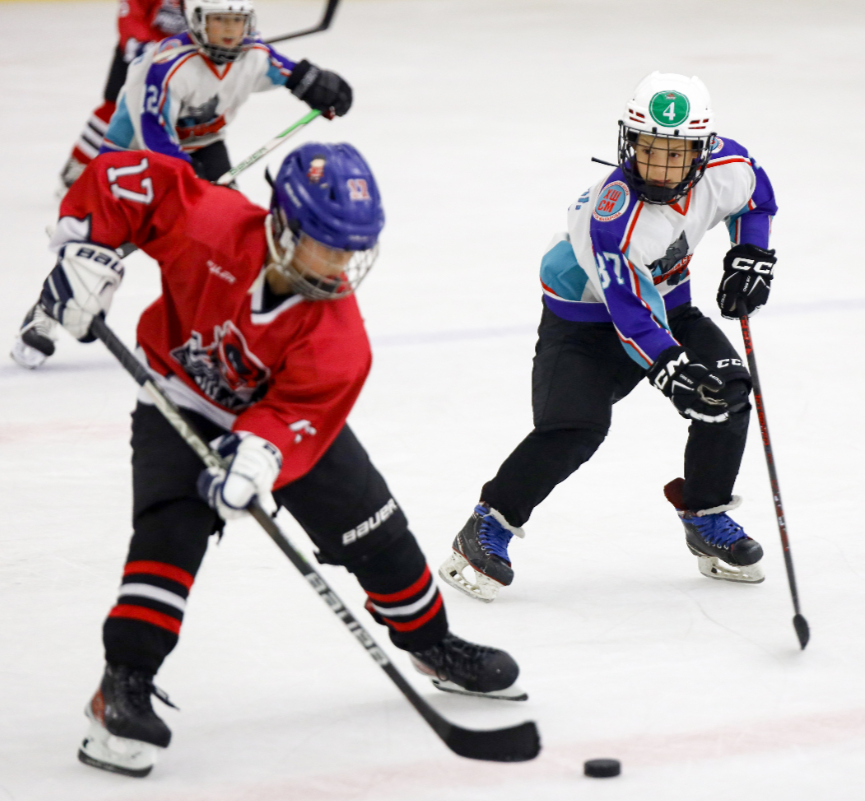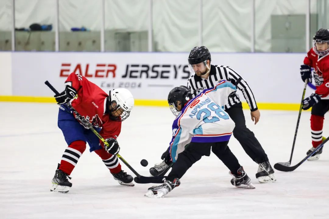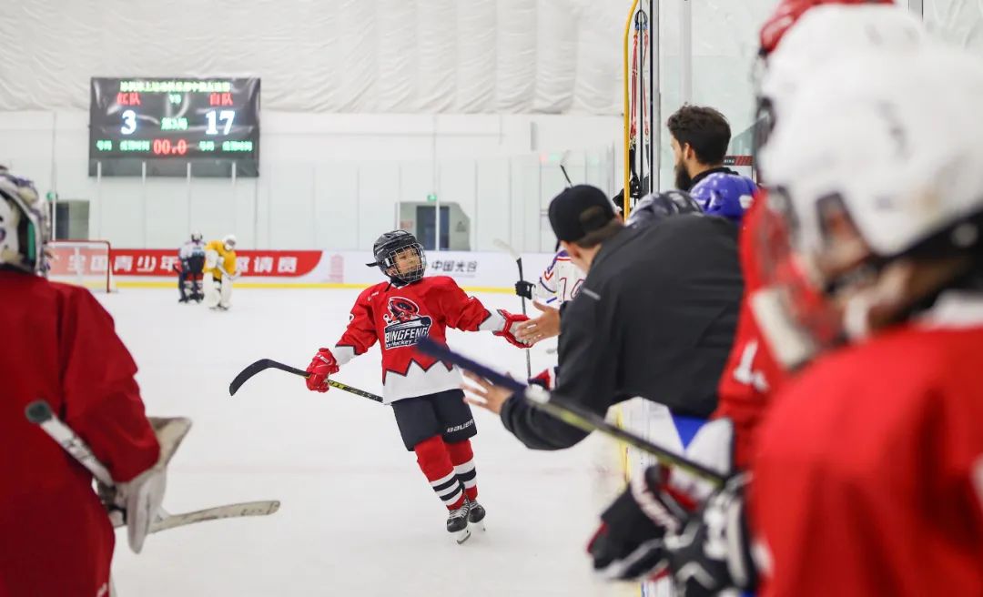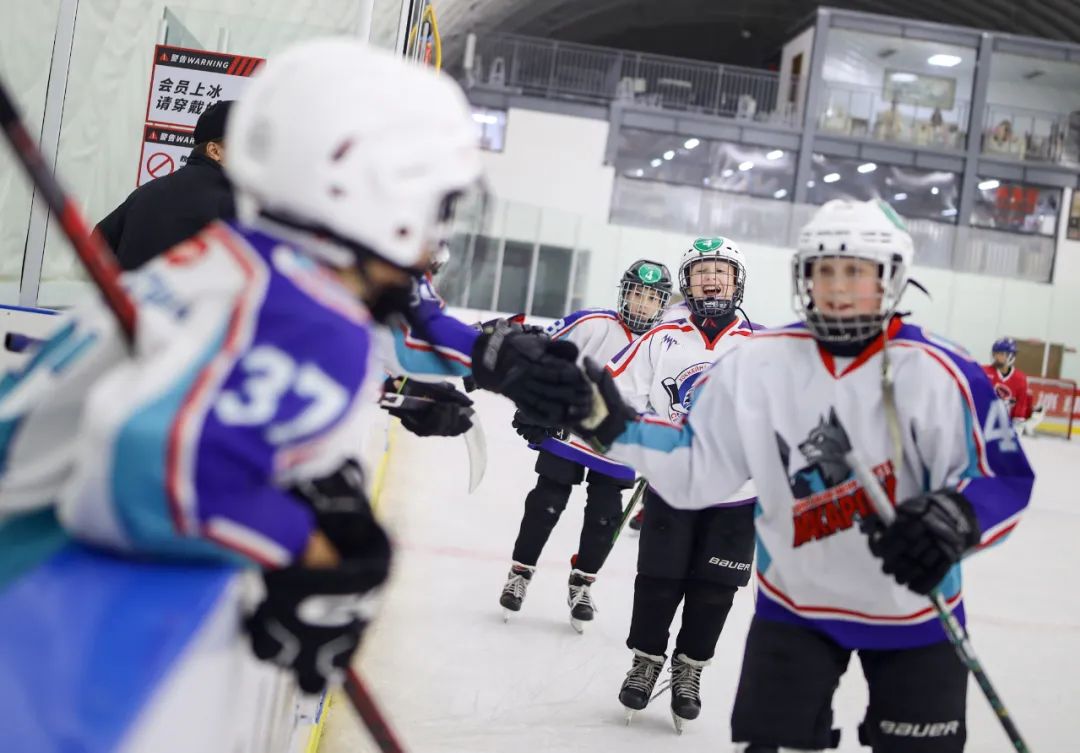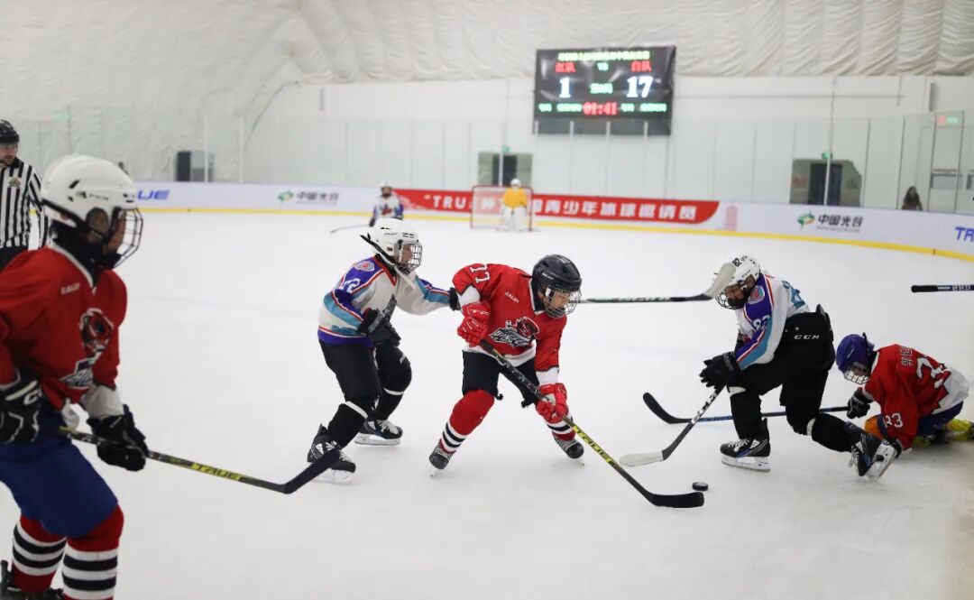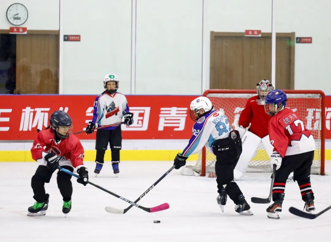 脚踩冰刀、手挥球杆,近30名“10后”队员佩戴头盔、面罩等,“全副武装”飞驰在冰面上,力图将球推入对方门中,不时发生激烈对抗。