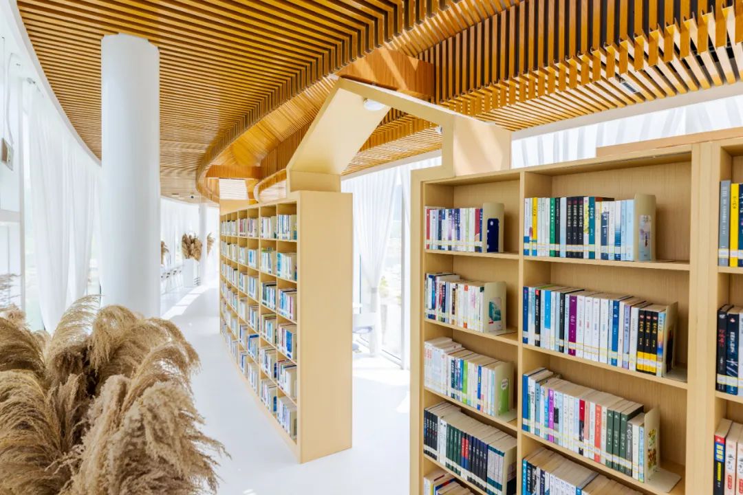 空中俯瞰,建筑形态类似“人文”两个汉字,5个白色弧形的玻璃盒子相互穿插链接,建筑风格简约现代。白天,阳光可透过屋顶天窗,照在书架上;夜间,月光从天窗中透入。