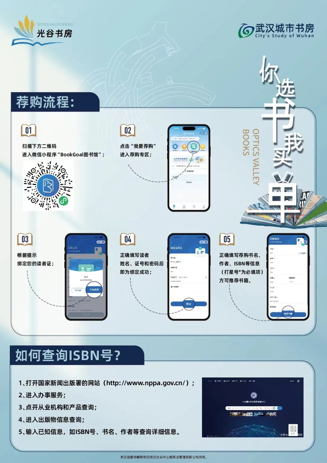 值得一提的是,在光谷书房·中央生态大走廊分馆首次办理读者证的用户可以参与“你选书我买单”活动。