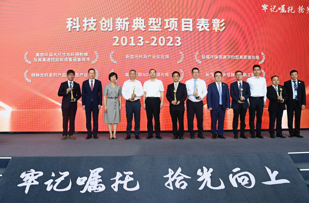 长飞公司党委书记、董事长马杰致辞,执行董事兼总裁庄丹汇报长飞“拾光答卷”。现场表彰了十年间公司科技创新典型项目,鼓舞科研工作者勇攀技术高峰。