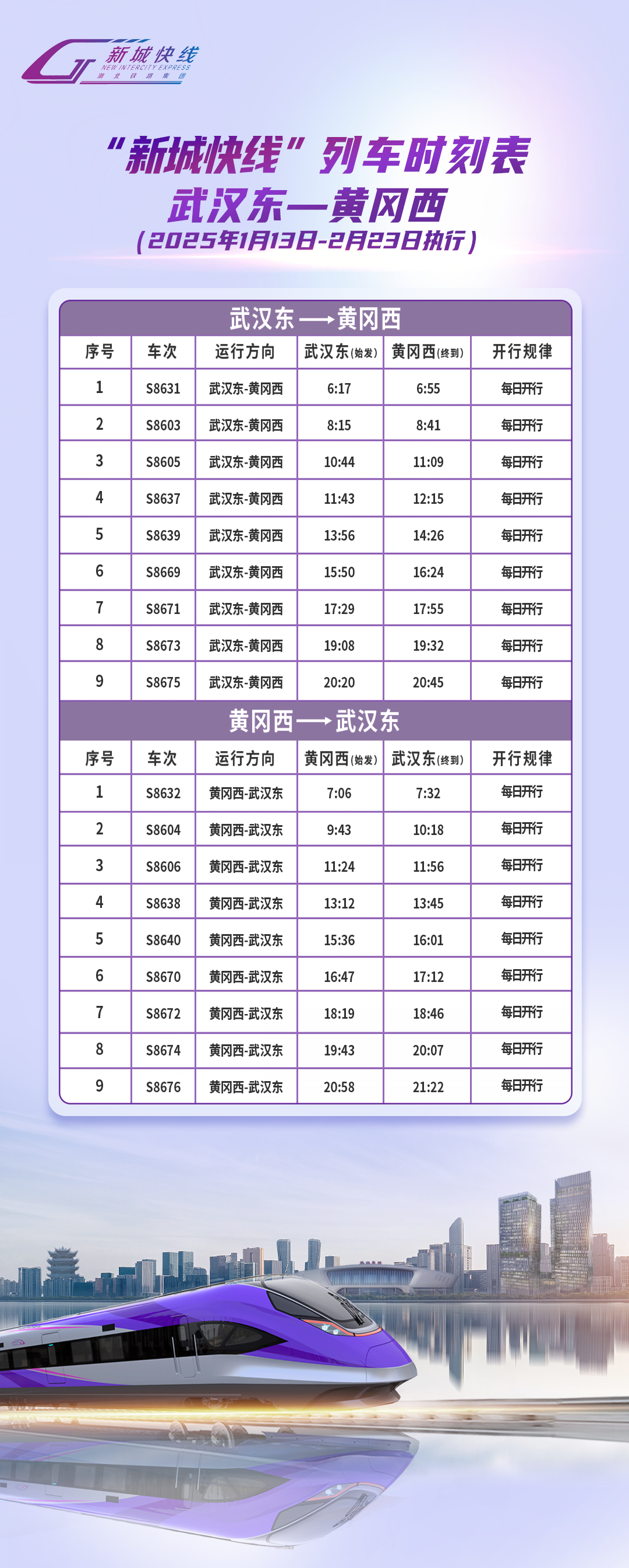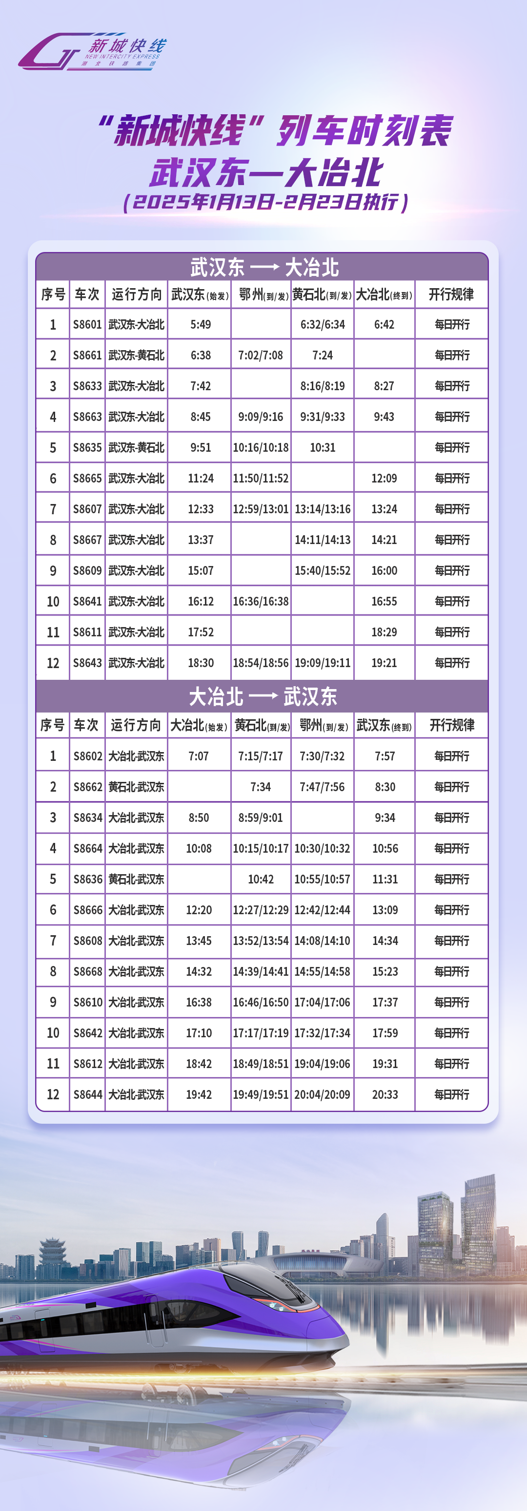 “新城快线”列车2025年春运期间时刻表(2025年1月13日-2月23日)
