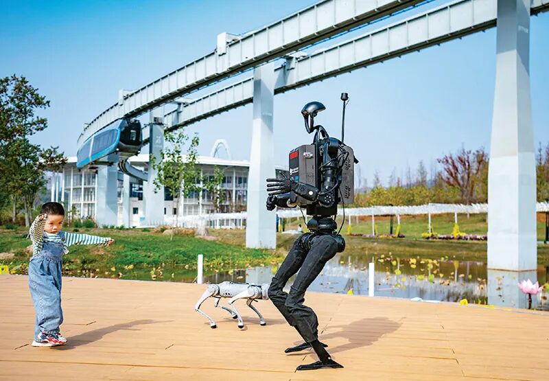 图为2024年11月14日,在武汉东湖高新区空轨高新大道站,一辆空轨列车正在驶过;生态大走廊上,装载了光谷造“大脑”的人形机器人和四足机器狗,正与看AI展的小朋友斗舞