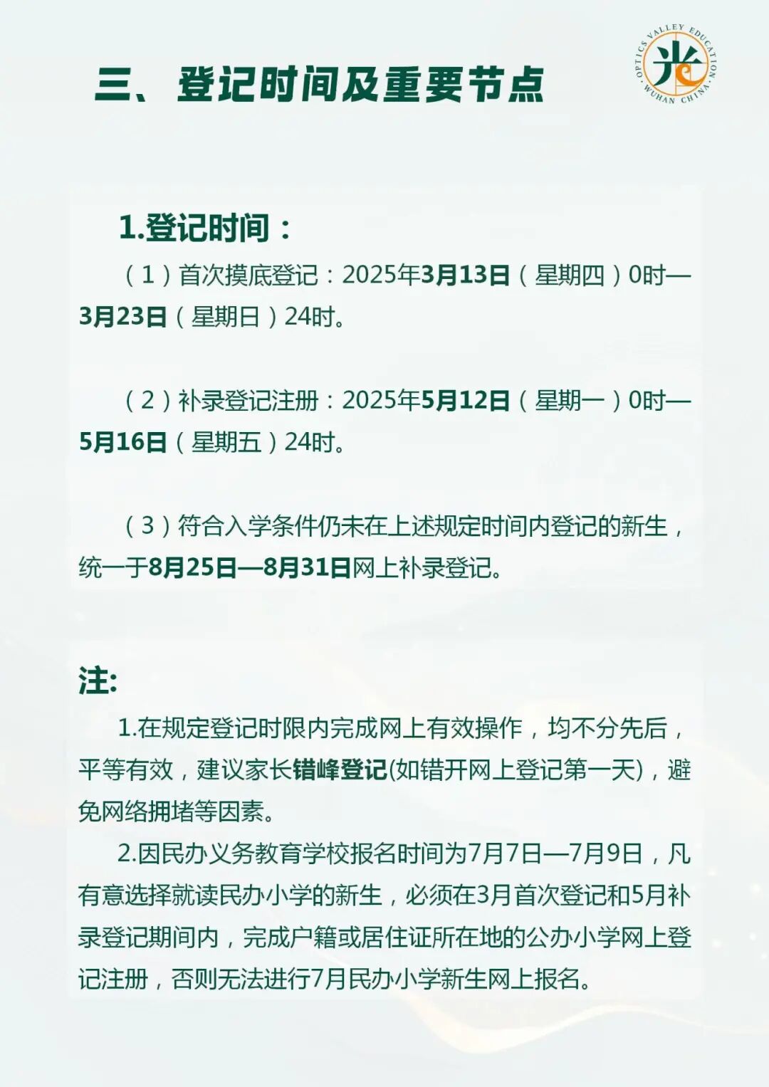 光谷家长们注意啦!2025年武汉义务教育新生入学通知来了!3月13日至3月23日(首次摸底登记时间),东湖高新区符合入学条件的小学一年级新生,可通过“武汉市中小学入学招生学籍一体化管理平台”完成填报。