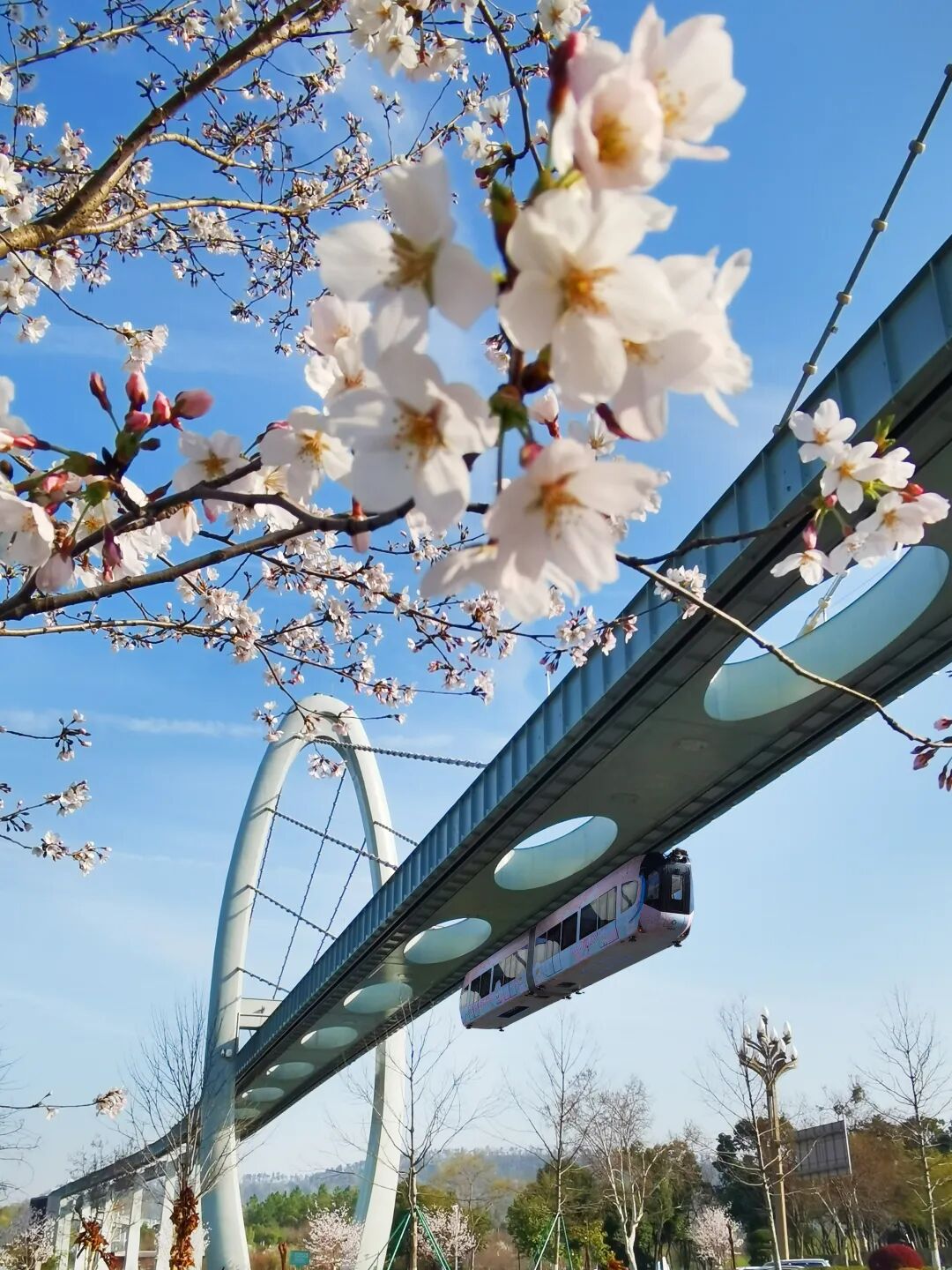 位于高新大道与光谷四路交叉口的西苑公园,湖边草坪既是露营者的“天选之地”,又是观赏光谷空轨与樱花同框的绝佳机位。市民游客漫步于此,可同时感受科技与自然的诗意碰撞。