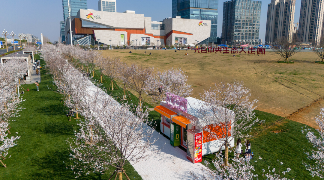 光谷中央生态大走廊大草坪坡面上,两株大规格的染井吉野樱花,形成了“樱花树下你最美”的绝佳打卡点。生态大走廊还矩阵式栽植了157株高杆染井吉野樱花,打造了一条如梦如幻的“落樱缤纷”樱花廊道。
