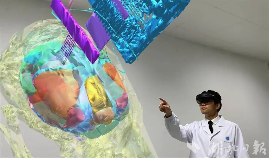 戴上一副MR(混合现实)眼镜,立刻拥有一双透视眼“穿透”颅骨和脑组织,脑机接口电极与大脑皮层、脑部血管的三维空间位置关系“纤毫毕现”呈现在眼前。