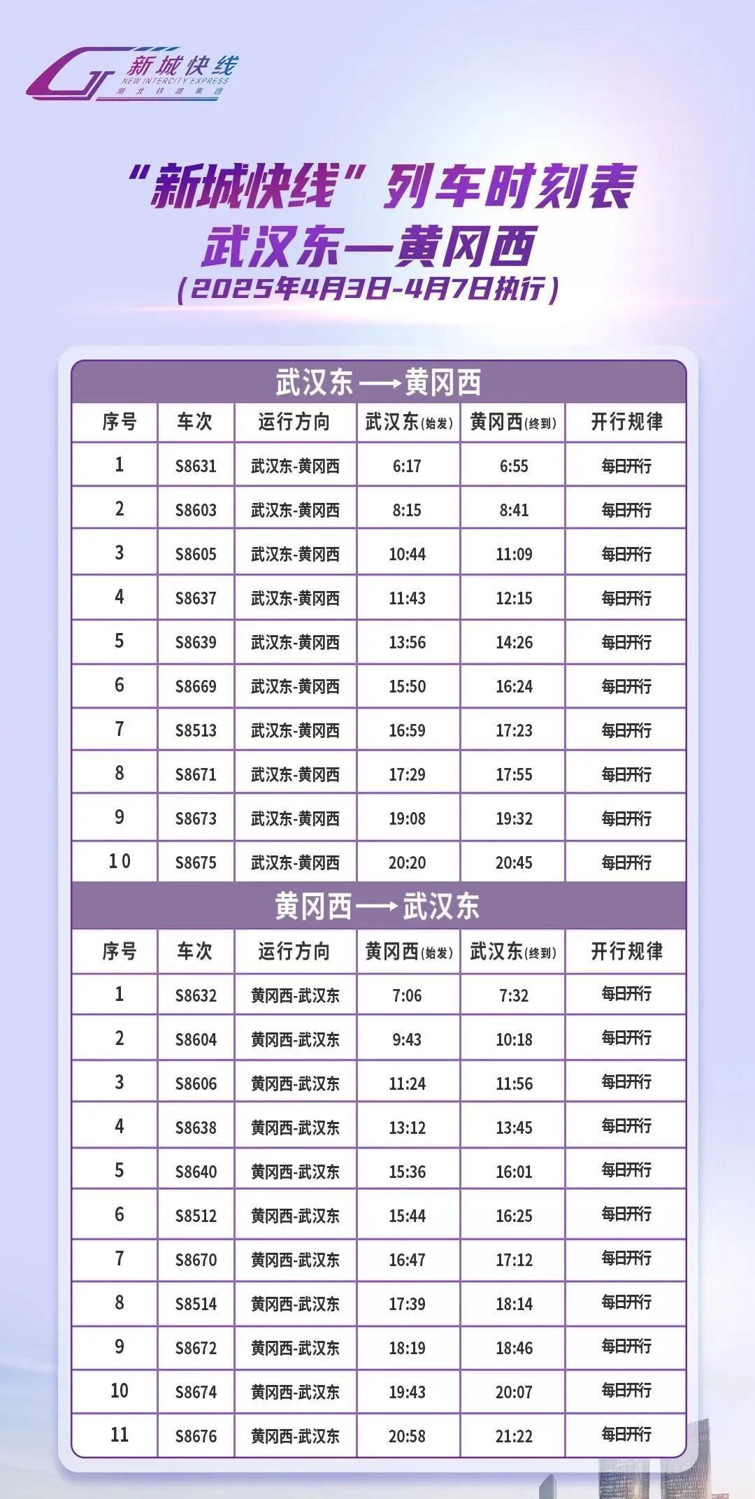 2025年清明节假期运输期限为4月3日至7日共计5天,“新城快线”列车将按45列/日开行。列车开行时刻表如下: