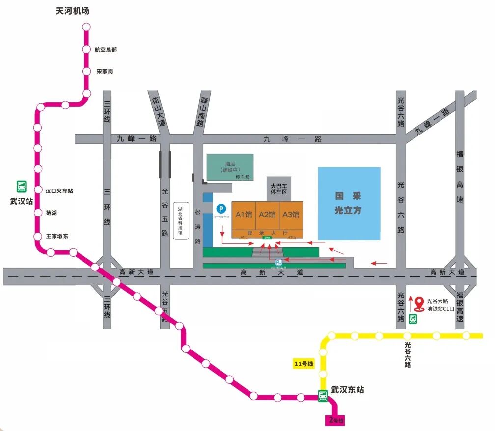 ②地铁前往:地铁11号线光谷六路C1出口下车(步行15分钟或转乘913路,高新大道中国十五冶下车)抵达展馆后,至A3馆入口处通过安检进入展馆。