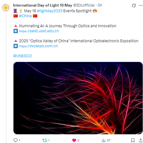 5月9日,联合国教科文组织“国际光日”组委会在官方社交媒体账号上推介第二十届光博会