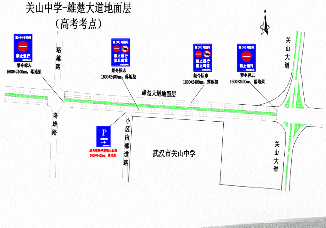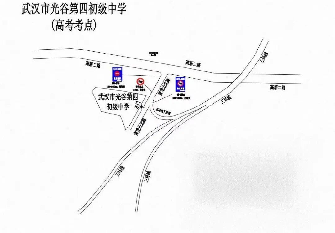 关山中学:雄楚大道关山大道路口至雄庄路路口实施临时交通管制,雄楚高架东西两端离考点300米合流段设置临时管控点对车辆进行临时管制。