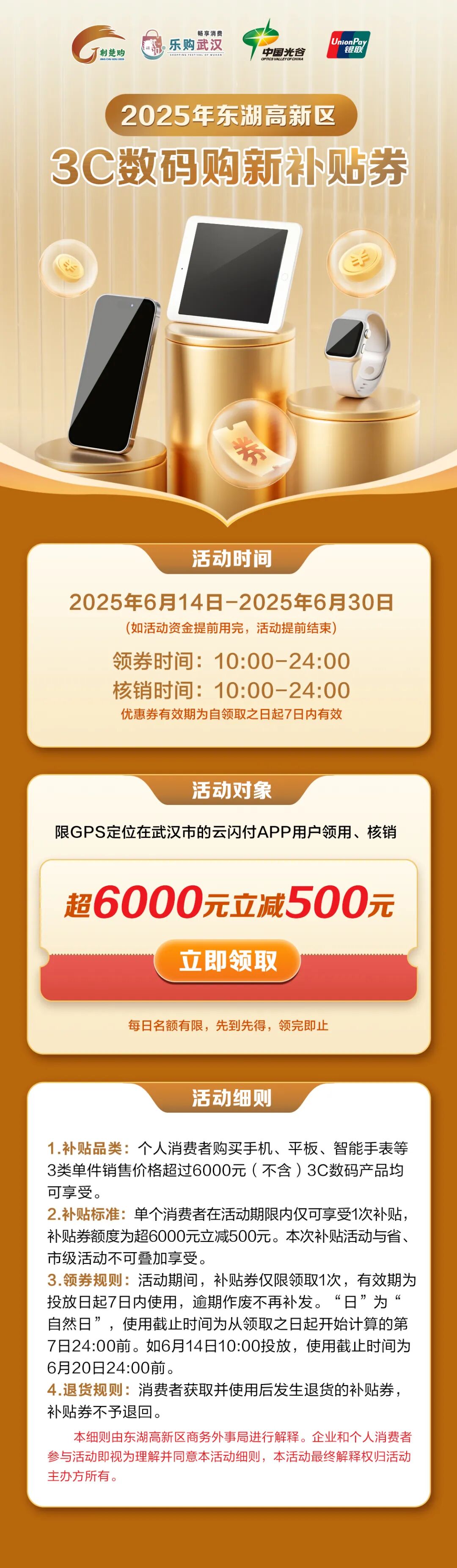 同时,东湖高新区还将发放3C数码消费券。个人消费者购买手机、平板、智能手表等3类产品可享满减优惠。