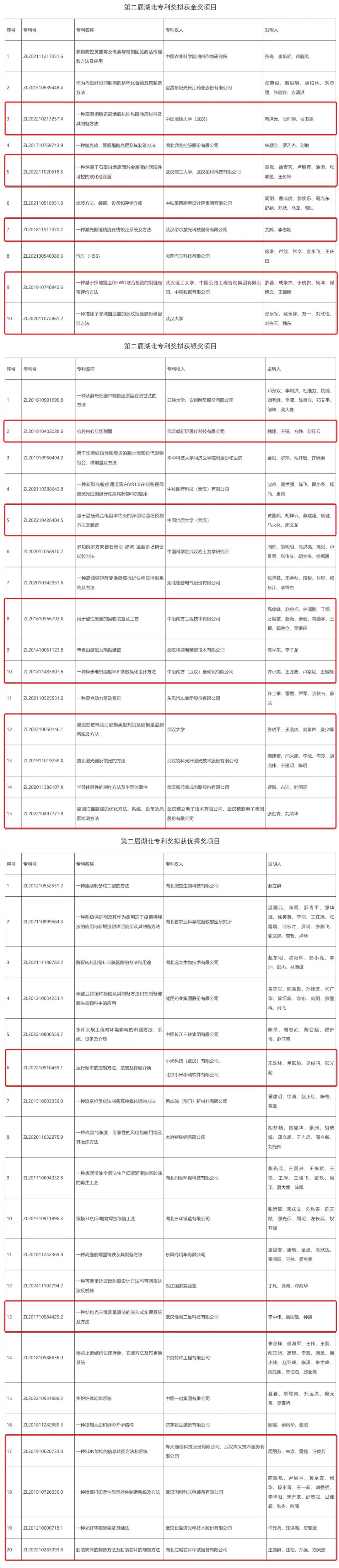 湖北专利奖由省人民政府设立,每5年评选一次,奖励在技术(设计)创新、保护及经济社会发展等方面做出突出贡献的专利权人和发明人(设计人)。第二届湖北专利奖共评出拟获金奖10项、拟获银奖15项、拟获优秀奖20项。