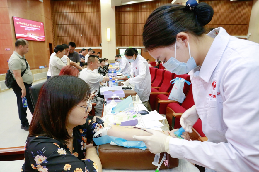 7月1日,在东湖高新区管委会组织的无偿献血活动现场,150位光谷人在医护人员的指引和科普下,按照献血程序进行填表、测血压、化验、采血,最终131人成功献血,总献血量30300毫升。