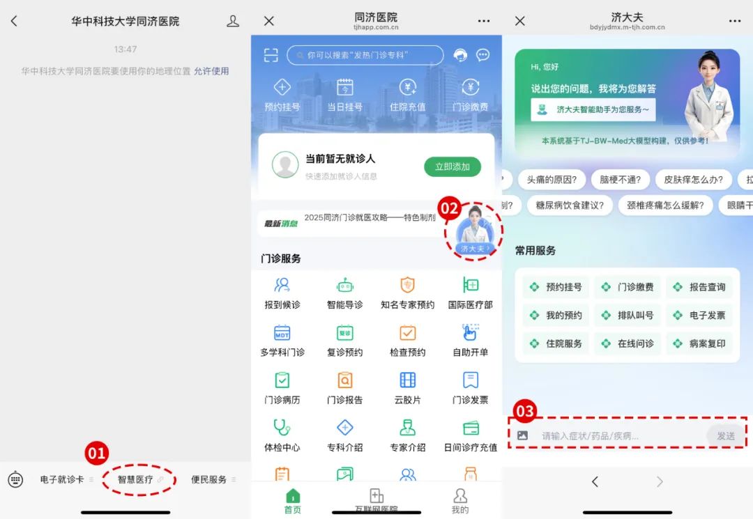 用户可关注“华中科技大学同济医院”官方服务号,点击菜单栏“智慧医疗”访问“济大夫”