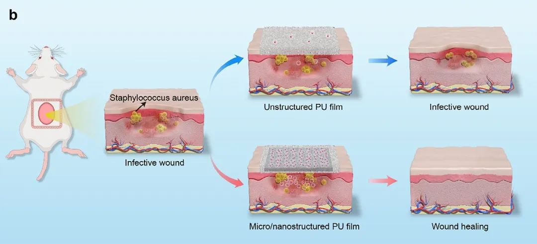 研究团队通过3D微纳米激光蚀刻技术,在聚氨酯薄膜中蚀刻抗生素储存憩室,成功使药物负载能力提升61倍,解决了敷料药物负载能力低的问题,同时保留了聚氨酯材料90%的机械强度和理化性能。这种新型敷料不仅能高效抑制金黄色葡萄球菌,还能在9天内将大鼠感染伤口的愈合速率提升43%,同时显著降低全身炎症反应风险。