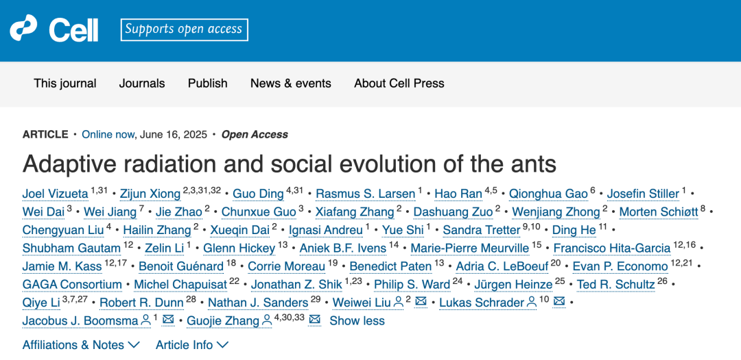 近期,由武汉华大生命科学研究院参与组织的“全球蚂蚁基因组联盟”(GAGA)在国际顶级学术期刊《细胞》(Cell )发表一项重磅研究,揭示了蚂蚁适应性辐射与社会性演化的遗传基础,为解析动物复杂性状的遗传机制提供重要启示。
