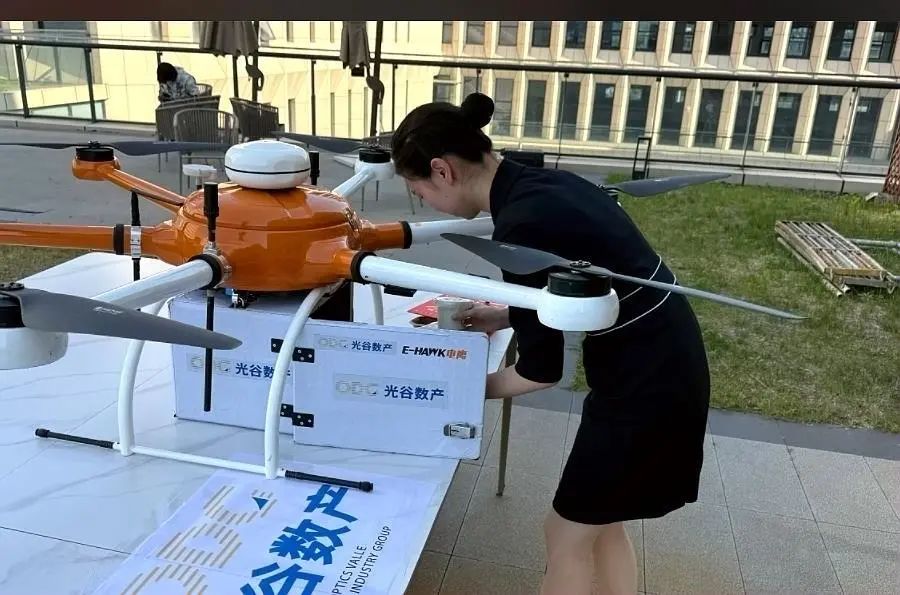 6月5日,光谷高新大道某咖啡馆外,8杯冰咖啡被稳稳装入无人机货箱,钟浠茜熟练地操作键盘,只见飞机平稳起飞、升空、转弯……向指定目的地飞走。5分钟后,两公里外的人工智能产业园接收点,无人机已稳稳降落。工作人员开箱验收,咖啡完好无损,甚至连冰块都还没融化!要知道,这段距离,外卖小哥通常需要骑行半小时。